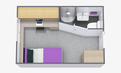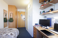 Students are accommodated in single en‑suite rooms, each with a single bed with under‑bed storage, desk with drawers, bookcase and lamp, desk chair, pin board, wardrobe, mini fridge, TV aerial socket and fast, reliable Wi‑Fi. Each room also includes an en‑suite bathroom with shower, toilet and sink. Students share a large communal kitchen space, which is deep‑cleaned twice per year.